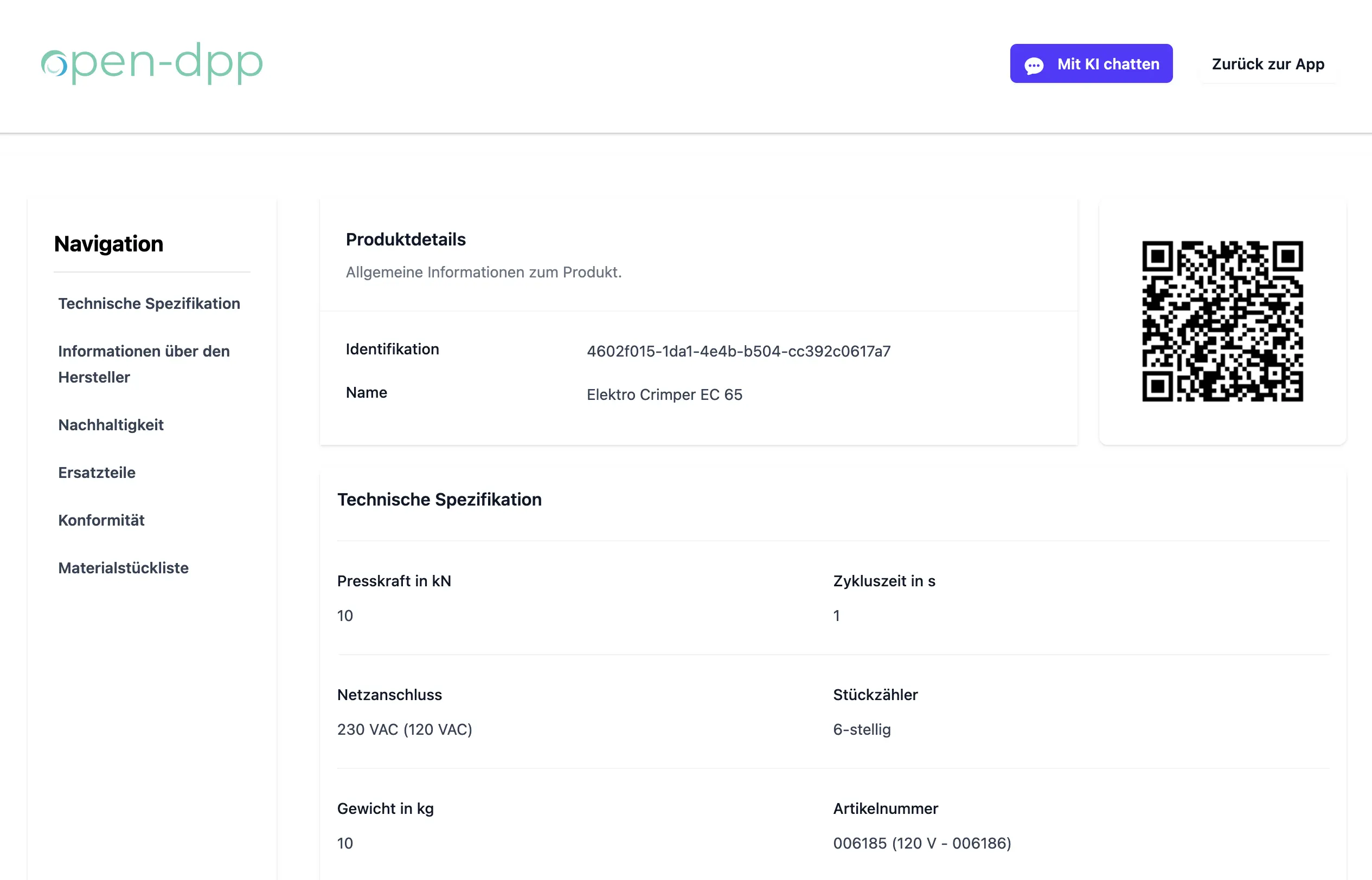 Sie können Ihre Verwaltungsschalen (Asset Administration Shell) direkt aus Proalpha zu open-dpp exportieren und Ihren Kunden als digitalen Produktpass zur Verfügung stellen.
